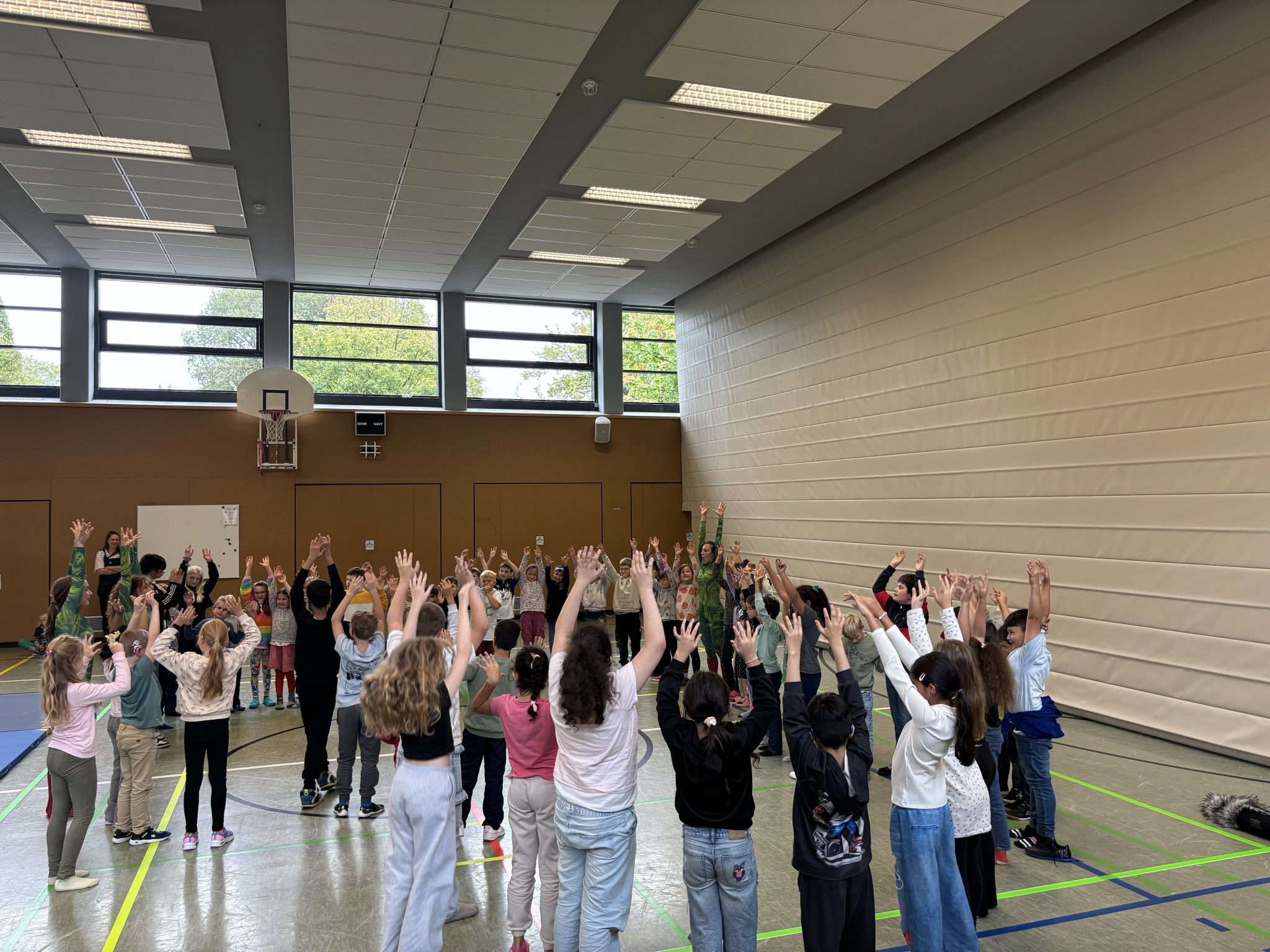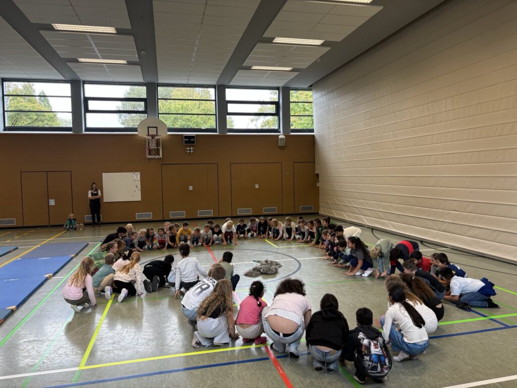 Sieben Klassen der Grundschule schauten in der Sporthalleneugierig zu, wie sich die drei Tänzerinnen in verschiedene Tiere und Fantasiewesen verwandelten. Für die Fantasiewesen haben sich die Tänzerinnen von den Kinderbuchklassikern „Die Raupe Nimmersatt“ und „Wo die wildenKerle wohnen“ inspirieren lassen. Zum Schluss durften auch die Kinder alle gemeinsam tanzen. In einer großen Polonaise ging es hintereinander her und im Kreis sind sie begeistert in die Bewegungen der Fantasiewesen geschlüpft. Im anschließenden Gespräch wollten die Kinder gar nicht mehr aufhören, den Tänzerinnen neugierige Fragen zu stellen.
